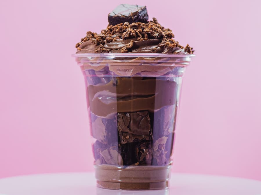 Copo com muito brigadeiro belga cremoso, pedaços de brownie e morangos picados.