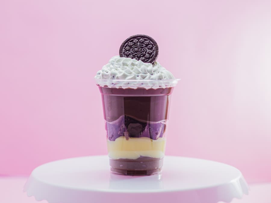 Copo com muito brigadeiro belga cremoso, pedaços de brownie e morangos picados.