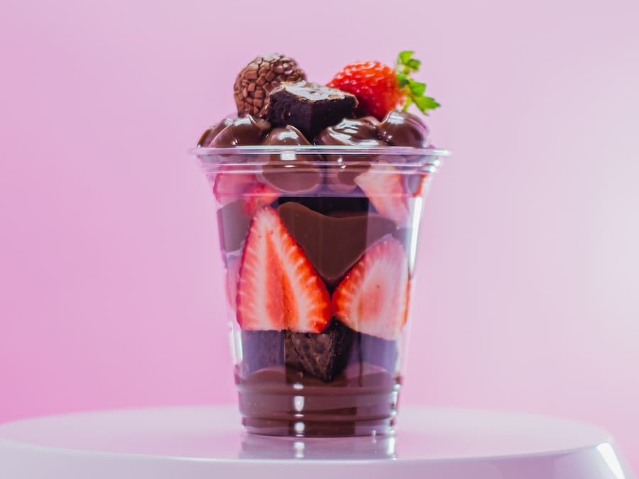 Copo com muito brigadeiro belga cremoso, pedaços de brownie e morangos picados.