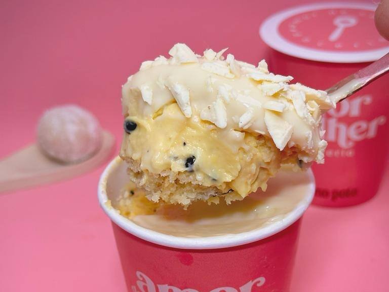 Massa de pão de ló fofinha molhada com calda de baunilha e recheado com ganache de maracuja fresco, finalizado com ganache e raspas de chocolate branco.