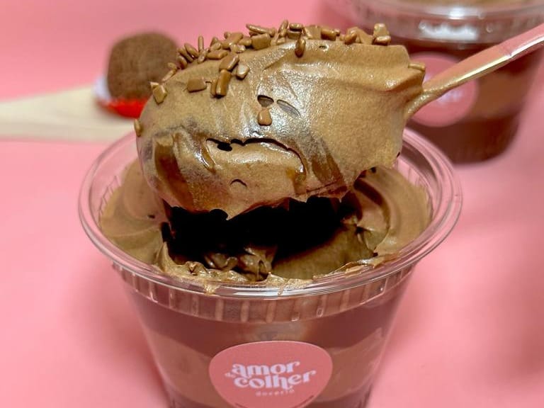 Mousse de chocolate intenso com cacau em pó Callebaut 70%, equilibrado com camadas de brigadeiro e ganache meio amargo, pra quem ama chocolate.
