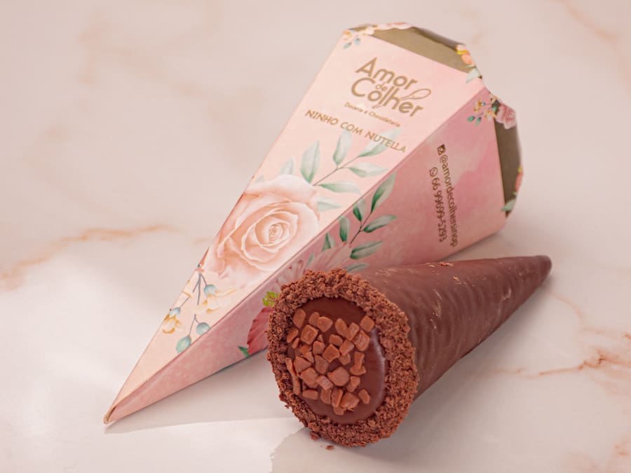 Casquinha de sorvete crocante banhada no chocolate meio amargo, recheado com creme de leite Ninho e Nutella.
